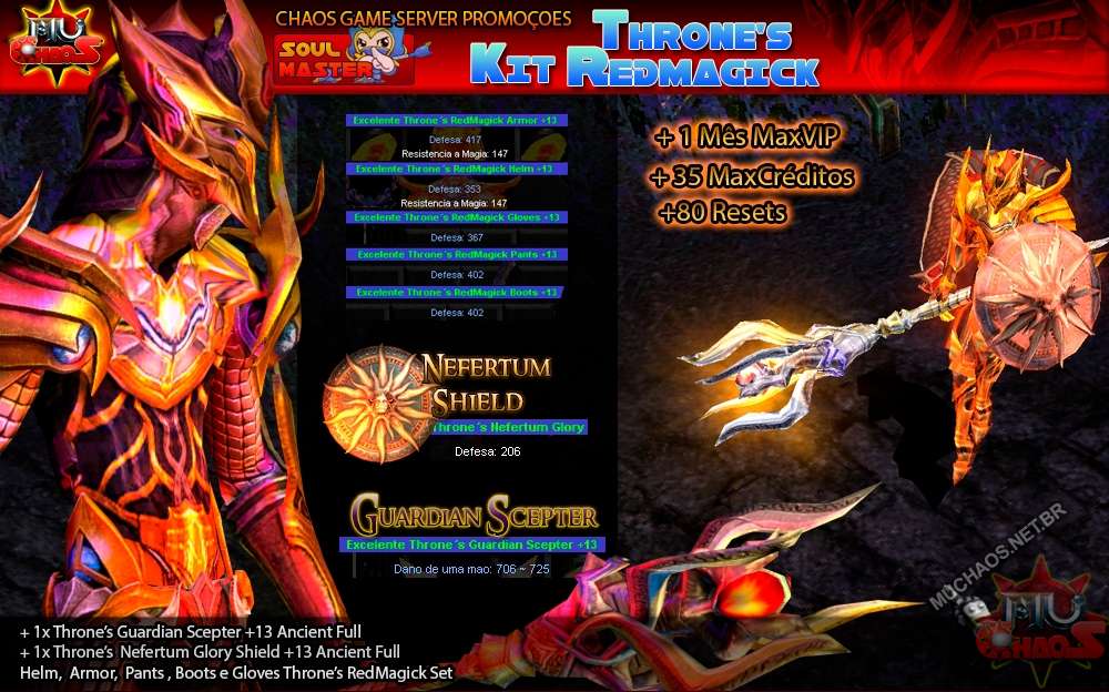 Kit Thrones Simples para seu SoulMaster. Contem 5x partes Thrones RedMagik+Full+Ancient, +1x Guardian Staff Ancient Full, +1x Nefertum Shield Ancient Full, +1 Mes de VIP MAX, 80 Resets e 35 MaxCreditos.