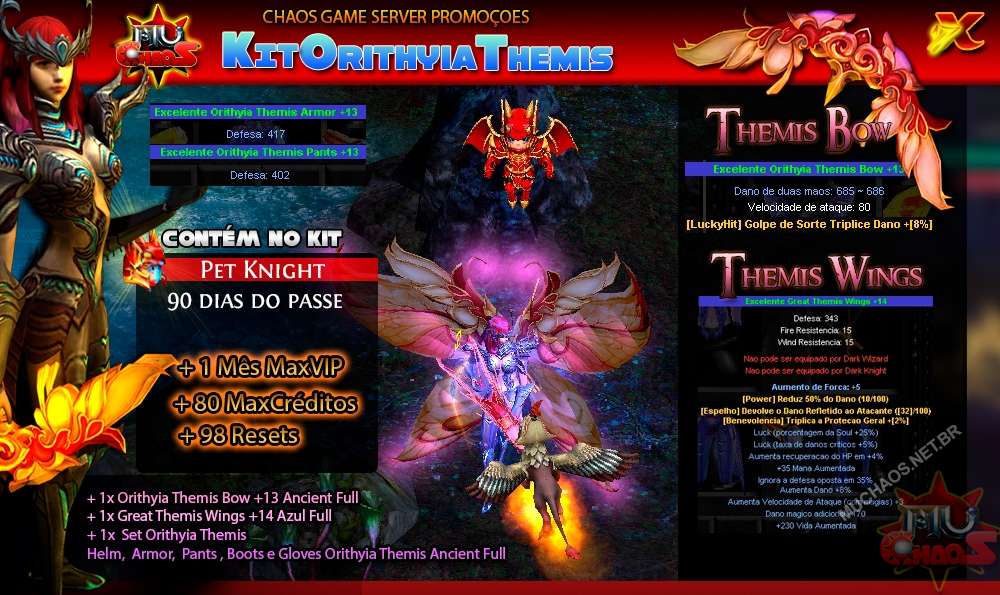 Kit Orithyia Completo com passe Trimestral do Pet Knight para sua Muse! Inclui 5x partes Orithyia Themis+Full+Ancient, +1x Themis Wings Lvl 4 Full Ancient, +Themis Bow Ancient Full, +Passe Trimestral Pet Knight, +1 Mes de VIP MAX, 80 Resets e 35 MaxCredit